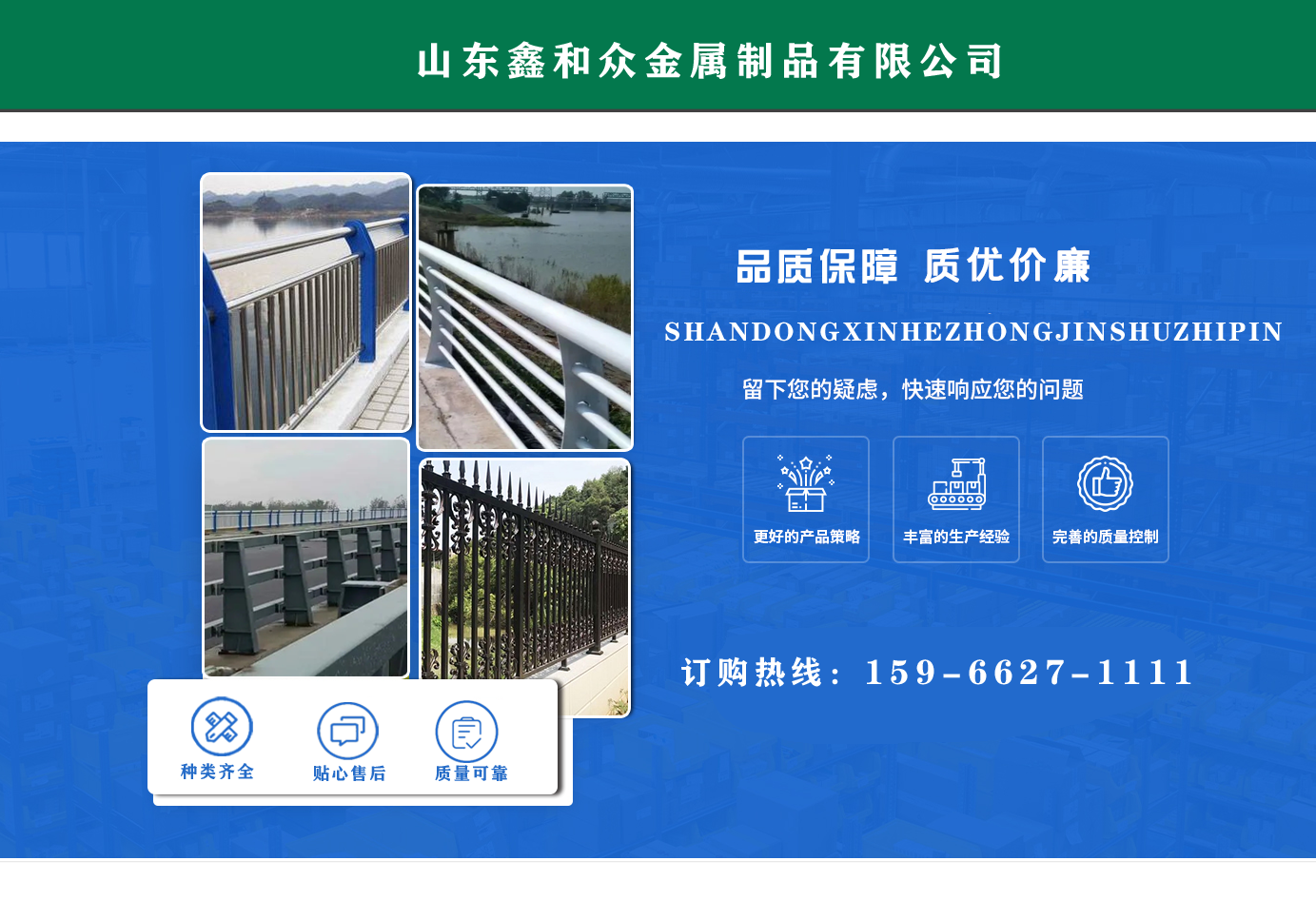 山東鑫和眾金屬制品有限公司主要產(chǎn)品有防撞護欄,橋梁護欄,道路護欄,河道護欄,不銹鋼護欄等護欄。提供設(shè)計方案,一站式定制,包您滿意價格優(yōu)惠,歡迎來電咨詢! 公司常年從事銷售護欄防撞護欄,橋梁護欄,道路護欄,河道護欄,不銹鋼護欄,橋梁鋼護欄,河道燈光護欄等。產(chǎn)品廣泛應(yīng)用于橋梁、河道、旅游景區(qū)、道路、公路、公園、小區(qū)、景觀、道路防撞等領(lǐng)域。 公司產(chǎn)品均采用優(yōu)質(zhì)不銹鋼材料,符合相關(guān)標準。各種型號不銹鋼復(fù)合管及護欄,質(zhì)量嚴格把控。產(chǎn)品強度高、耐腐蝕、焊接牢固、抗沖擊、性能好,防撞護欄結(jié)構(gòu)簡單、美觀實用大方?! g迎前來訂購!...
